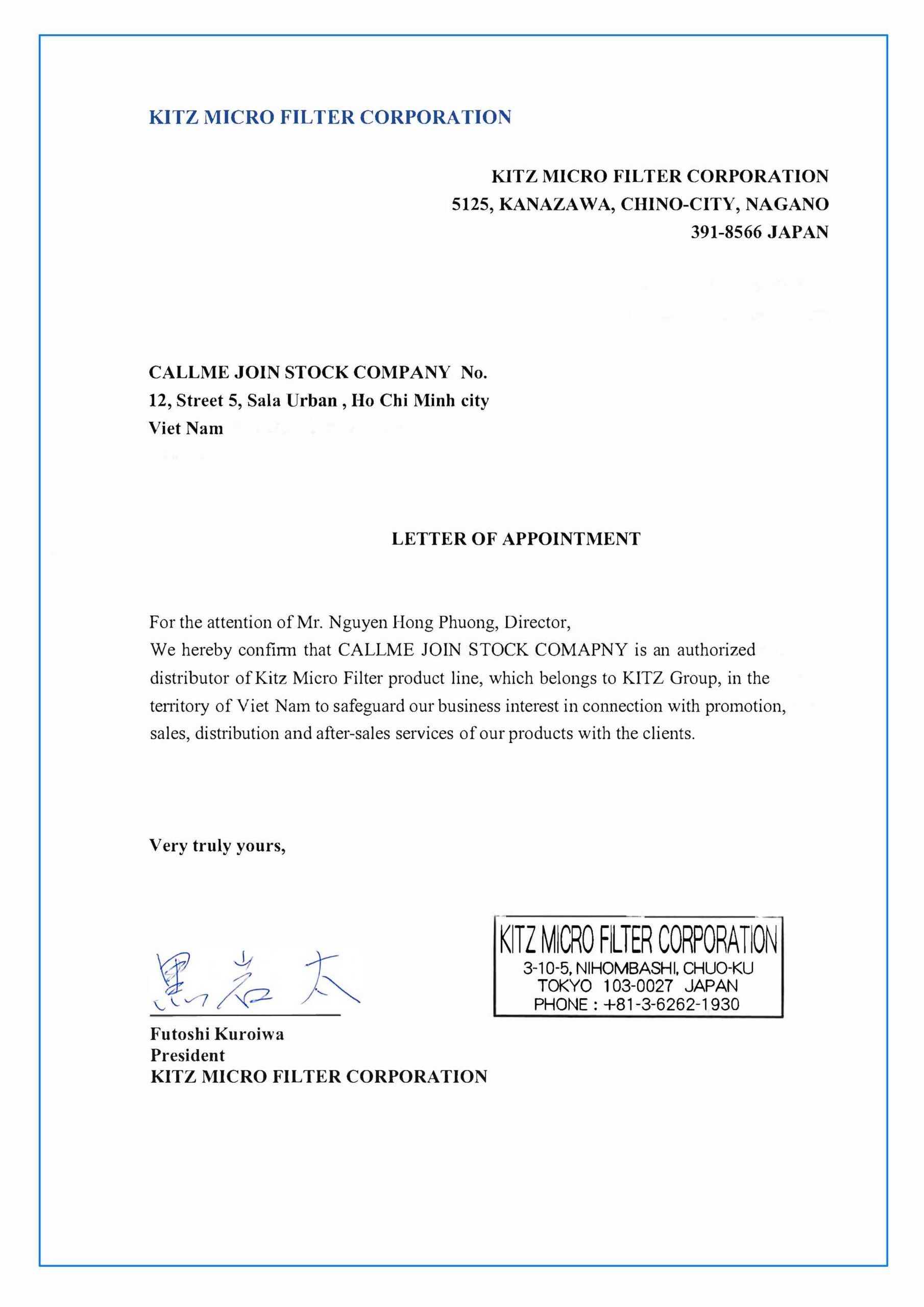 CALLME CHÀO ĐÓN CÁC CHUYÊN GIA NHẬT BẢN ĐẾN TỪ NHÀ MÁY KITZ MICRO FILTER