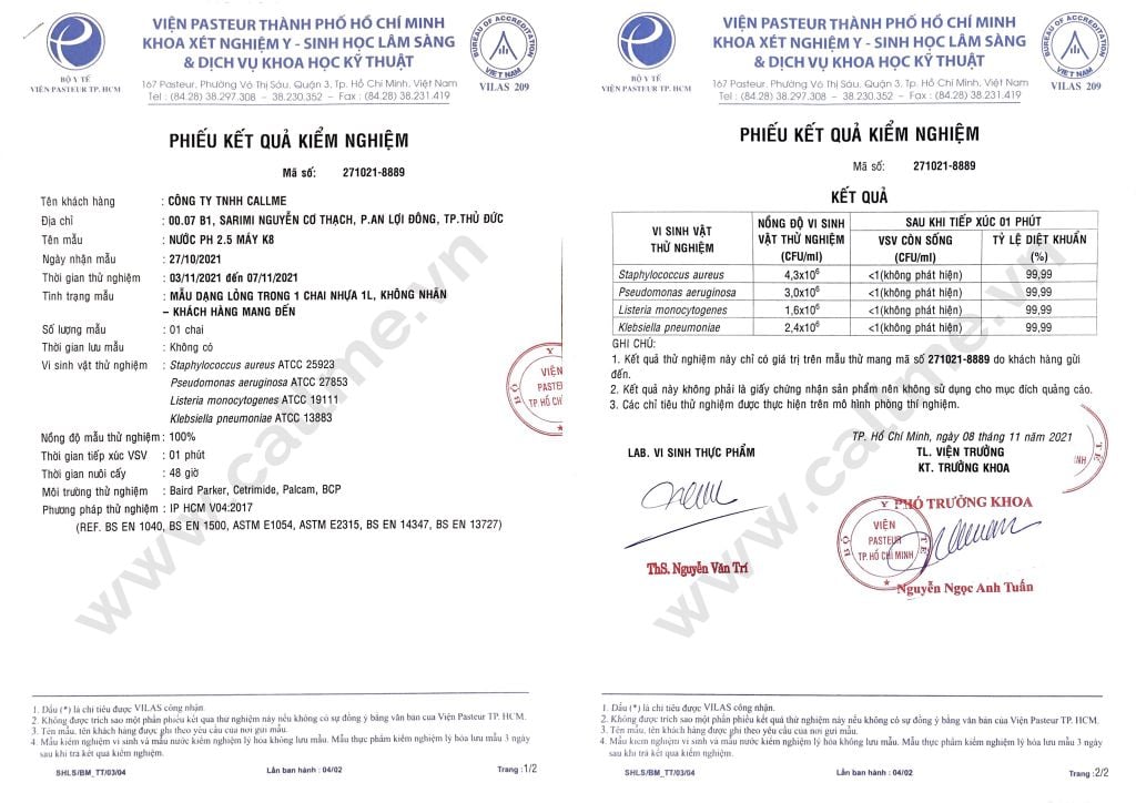 Để kiểm tra về khả năng diệt khuẩn từ nước pH2.5, mời bạn xem kết quả thử nghiệm được kiểm tra tại viện Pasteur đối với thử nghiệm chế phẩm diệt khuẩn dùng trong gia dụng và y tế.