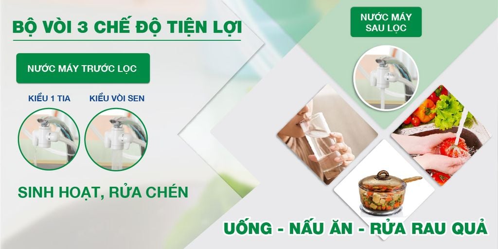 Ở chế độ này nước sẽ chảy qua bộ lọc OSSC-7 nên hoàn toàn sạch có thể sử dụng để uống trực tiếp mà không cần đun sôi hoặc có kết hợp lấy nước dùng cho nấu ăn, rửa rau quả.